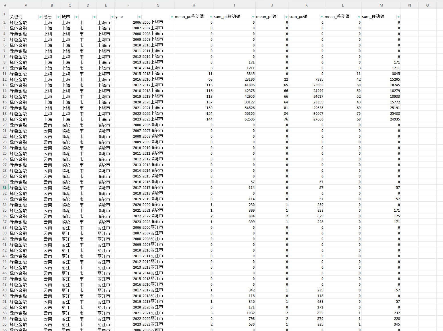 鉴于地级市绿色金融难以度量,现有指标体系存在数据难以获取或缺失值较多等问题,手工整理了"绿色金融"这一关键词的百度指数,时间跨度2006——2023年,囊括392个地级市和直辖市