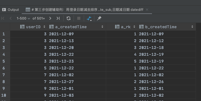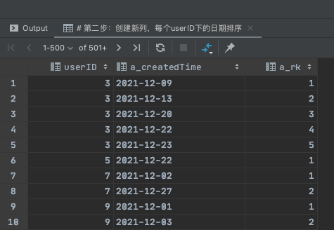 select userID,a_createdTime,row_number() over(partition by userId order by a_createdTime) a_rk # 知识点3:用row_number() 对每个userID下的a_createdTime进行排名
