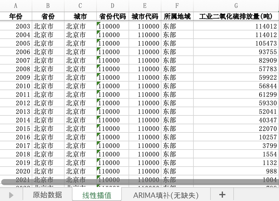 年份 | 省份 | 城市 | 省份代码 | 城市代码 | 所属地域 | 工业二氧化硫排放量(吨)