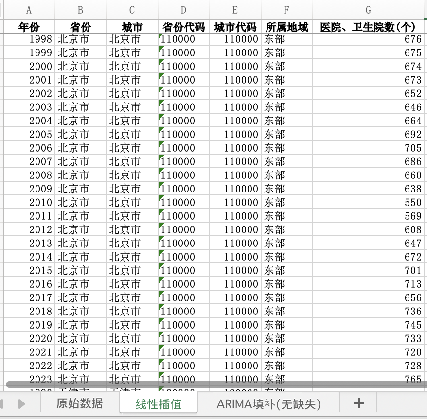 年份 | 省份 | 城市 | 省份代码 | 城市代码 | 所属地域 | 医院、卫生院数(个)