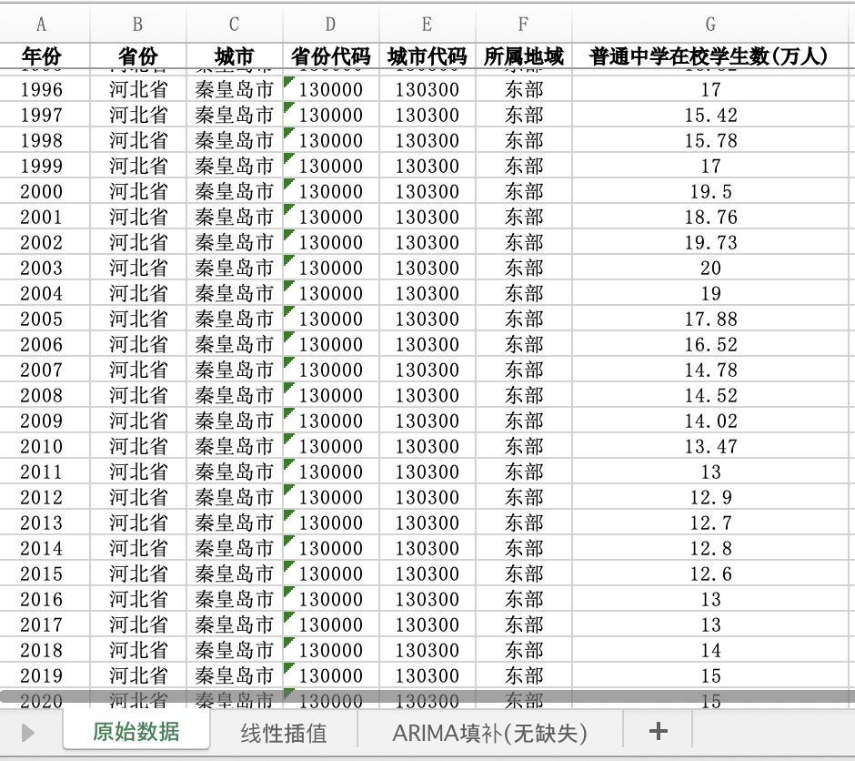 年份 | 省份 | 城市 | 省份代码 | 城市代码 | 所属地域 | 普通中学在校学生数(万人)