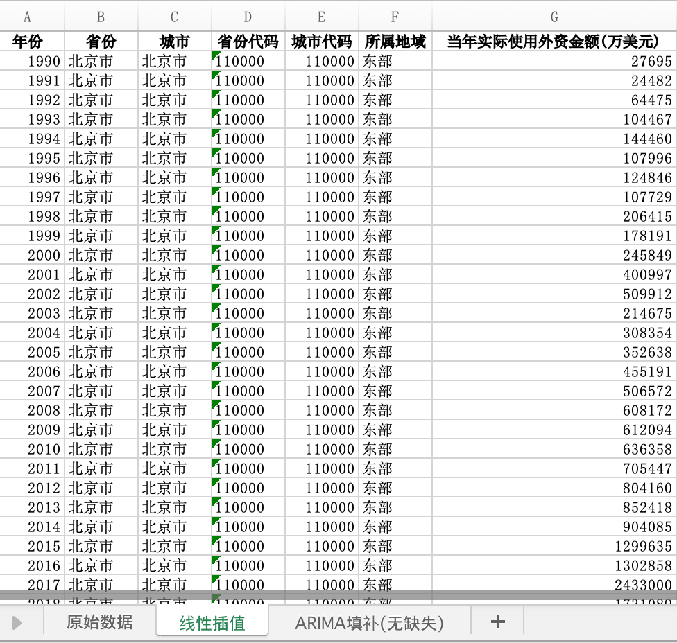 年份 | 省份 | 城市 | 省份代码 | 城市代码 | 所属地域 | 当年实际使用外资金额(万美元)