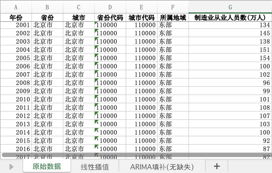 年份 | 省份 | 城市 | 省份代码 | 城市代码 | 所属地域 | 制造业从业人员数(万人)
