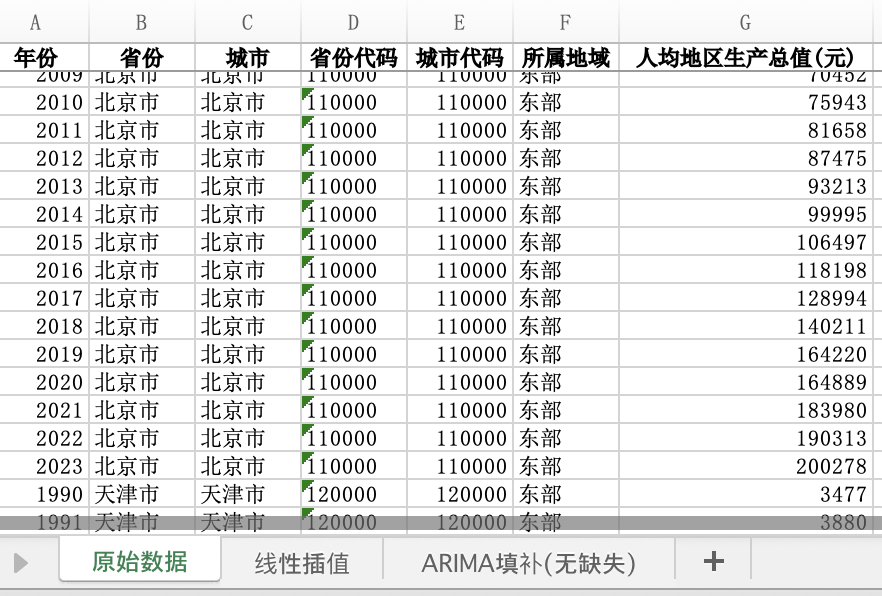年份 | 省份 | 城市 | 省份代码 | 城市代码 | 所属地域 | 人均地区生产总值(元)
