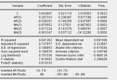 ermutuxia 发表于 2012-5-11 15:51 yt=0.042+0.207y(t-1)-0.538y(t-2)-0.879e(t-1)+0.817*e(t-2)-0.903*e(t-3)