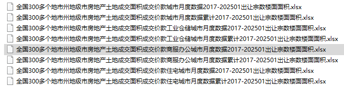 全国300多个地市州地级市房地产土地成交面积成交价款住宅商服办公楼工业仓储城市月度数据累计2017-202501出让宗数楼面面积