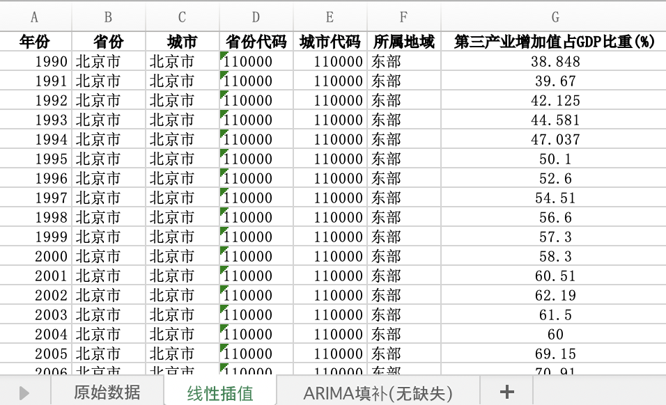 年份 | 省份 | 城市 | 省份代码 | 城市代码 | 所属地域 | 第三产业增加值占GDP比重(%)