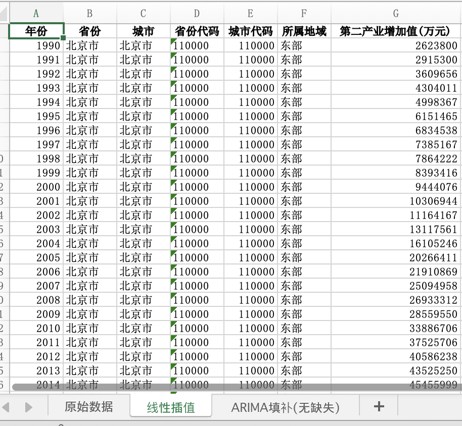 年份 | 省份 | 城市 | 省份代码 | 城市代码 | 所属地域 | 第二产业增加值(万元)