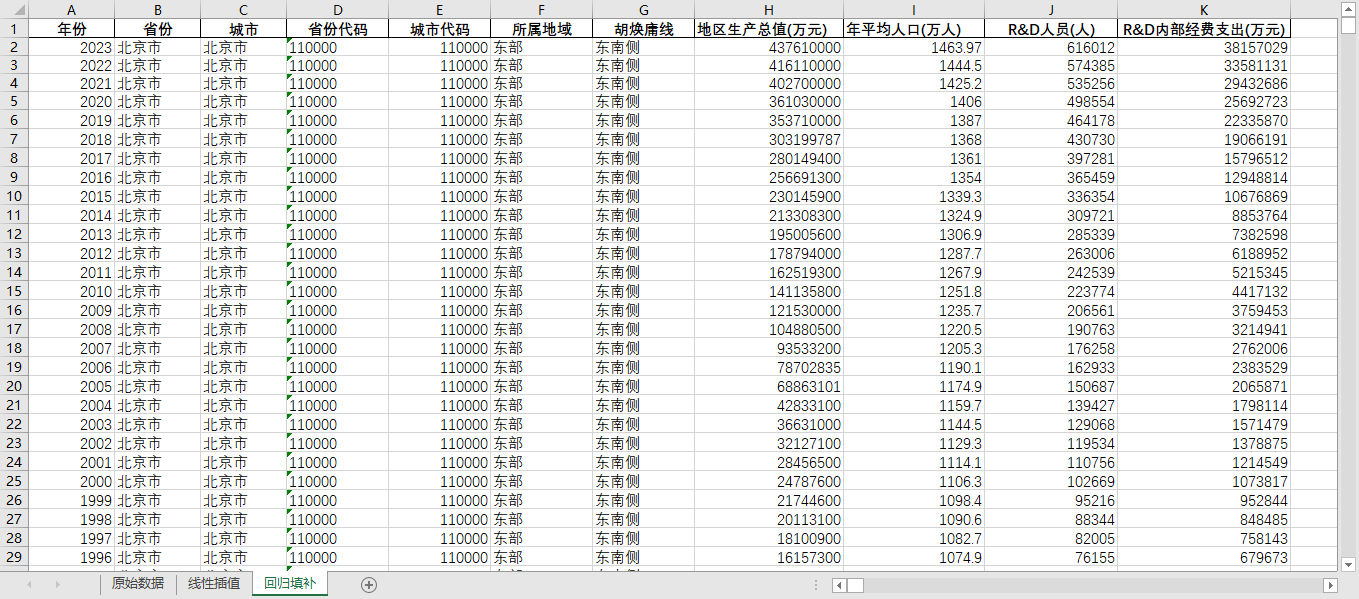 年份 省份 城市 省份代码 城市代码 所属地域 胡焕庸线 地区生产总值(万元) 年平均人口(万人) R&D人员(人) R&D内部经费支出(万元)