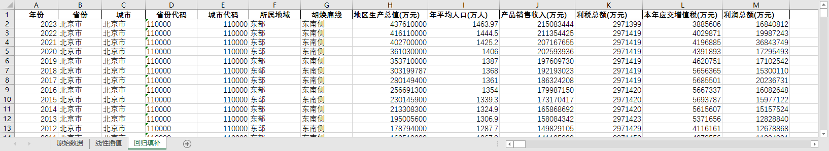 ARIMA回归填补。基于ARIMA模型,利用同一地区的时间序列数据,对缺失值进行预测填补。
