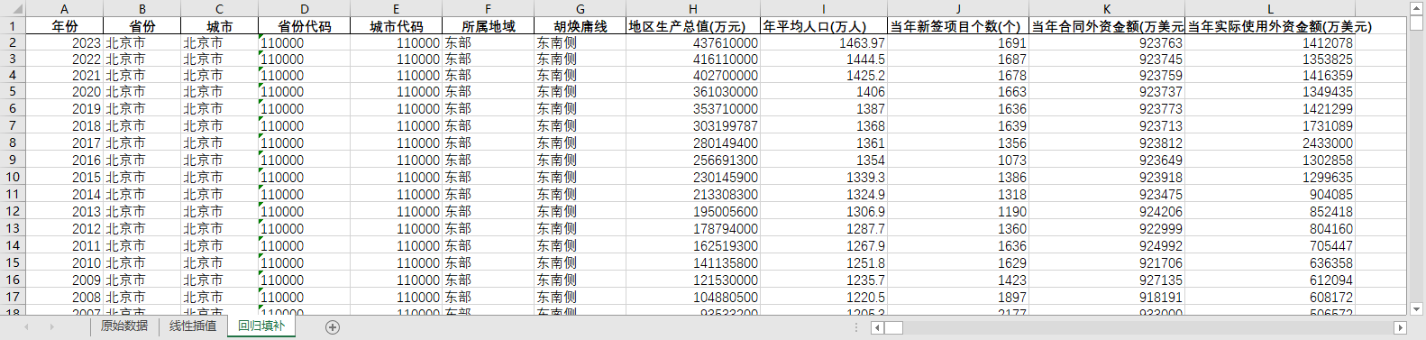 ARIMA回归填补。基于ARIMA模型,利用同一地区的时间序列数据,对缺失值进行预测填补。