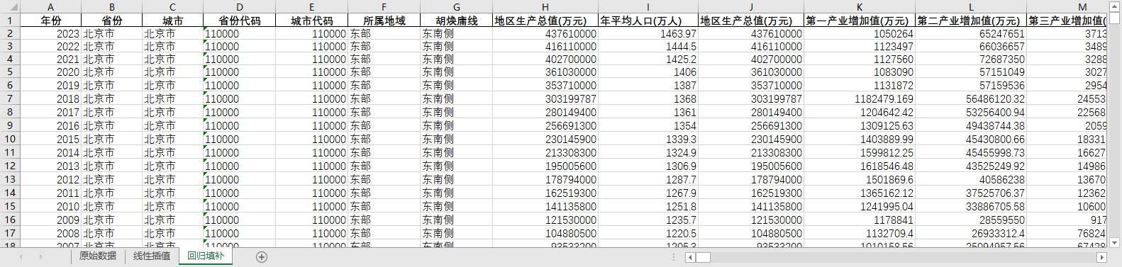 ARIMA回归填补。基于ARIMA模型,利用同一地区的时间序列数据,对缺失值进行预测填补。