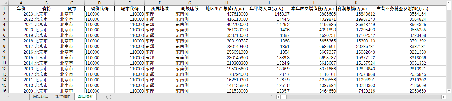 年份 省份 城市 省份代码 城市代码 所属地域 胡焕庸线 地区生产总值(万元) 年平均人口(万人) 本年应交增值税(万元) 利润总额(万元) 主营业务税金及附加(万元)