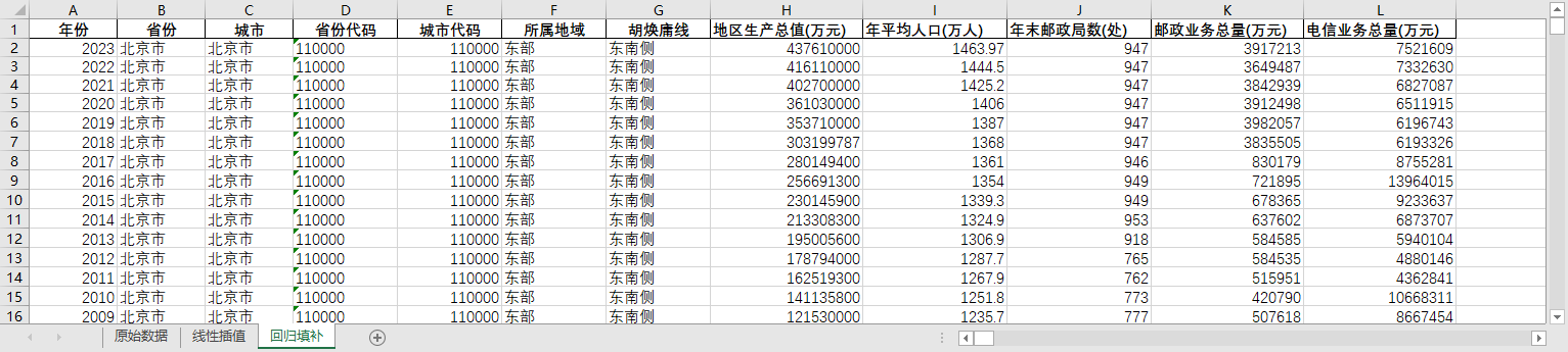 年份 省份 城市 省份代码 城市代码 所属地域 胡焕庸线 地区生产总值(万元) 年平均人口(万人) 年末邮政局数(处) 邮政业务总量(万元) 电信业务总量(万元)