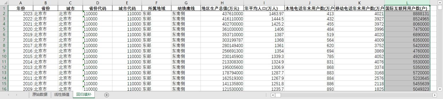 年份 省份 城市 省份代码 城市代码 所属地域 胡焕庸线 地区生产总值(万元) 年平均人口(万人) 本地电话年末用户数(万户) 移动电话年末用户数(万户) 国际互联网用户数(户)