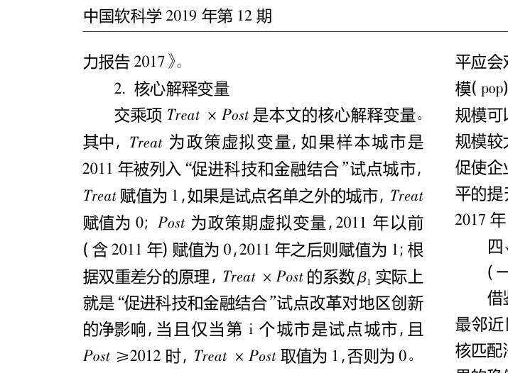 2.测算说明:参考《中国软科学》马凌远(2019)老师的做法,使用交乘项 Treat × Post 是本文的核心解释变量。其中,Treat 为政策虚拟变量,如 果 样 本 城 市 是2011 年被列入“促进科技和金融结合”试点城市,Treat 赋值为 1,如果是试点名单之外的城市,Treat赋值为 0; Post 为政策期虚拟变量,2011 年以前( 含 2011 年) 赋值为 0,2011 年之后则赋值为 1; 根据双重差分的原理,Treat × Post 的系数 β1 实际上就是“促进科技和金融结合”试点改革对地区创新的净影响,当且仅当第 i 个城市是试点城市,且Post ≥2012 时,Treat × Post 取值为 1,否则为 0。