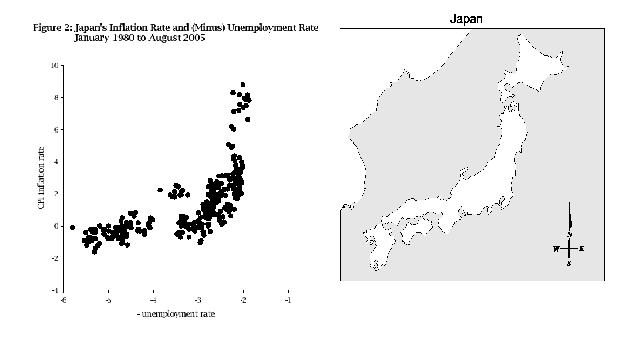 Journal of Money, Credit and Banking,2008年第6期,1325-1326页。这篇文章作者是Gregor Smith,他提出一个看法是“日本的菲利普斯曲线外形就跟日本版图一样”。下面就是他在working paper阶段描的图。数据是1980到2005,来源于IMF。