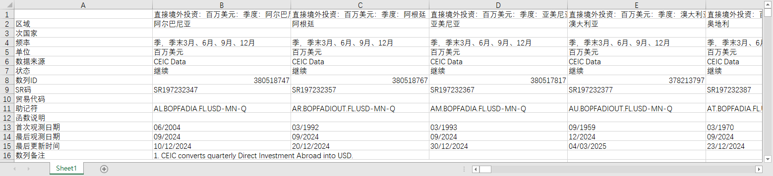 全球世界各国地区直接境外投资OFDI美元1990-2024季度数据