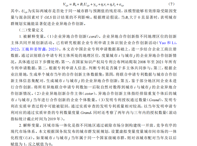 本文在中国企业专利申请数据基础上,进一步结合企业工商注册数据,通过识别联合申请专利主体所处的地理区位,度量城市 i 与城市 j 的企业异地合作创新情况。具体通过以下步骤处理:第一,在国家知识产权局专利公布网站爬取 2008 年至 2021 年所有专利申请数据;第二,根据专利申请人信息,判断专利是否属于多主体共同参与;第三,根据企业注册地,生成单个城市当年的合作创新主体数据集;第四,将联合申请专利数据与城市合作创新主体信息集配对,生成城市 i 与城市 j 的企业异地合作创新;第五,鉴于部分地区间企业未进行合作创新,将所有异地联合申请专利数加一后取自然对数得到城市 i 与城市 j 的企业异地合作创新情况。(2)企业异地创新合作主体(cotor),异地合作创新主体指经排除重复个体后的城市 i 与城市 j 当年进行合作创新的企业个体数量。(3)发明专利授权通过数量(Grand),发明专利在实质审查过程中可能被驳回,通过实质审查的发明专利质量相对较高,以当年发明申请专利对应的通过实质审查的专利数量度量 Grand,同时还考察了两年内与三年内的授权数量