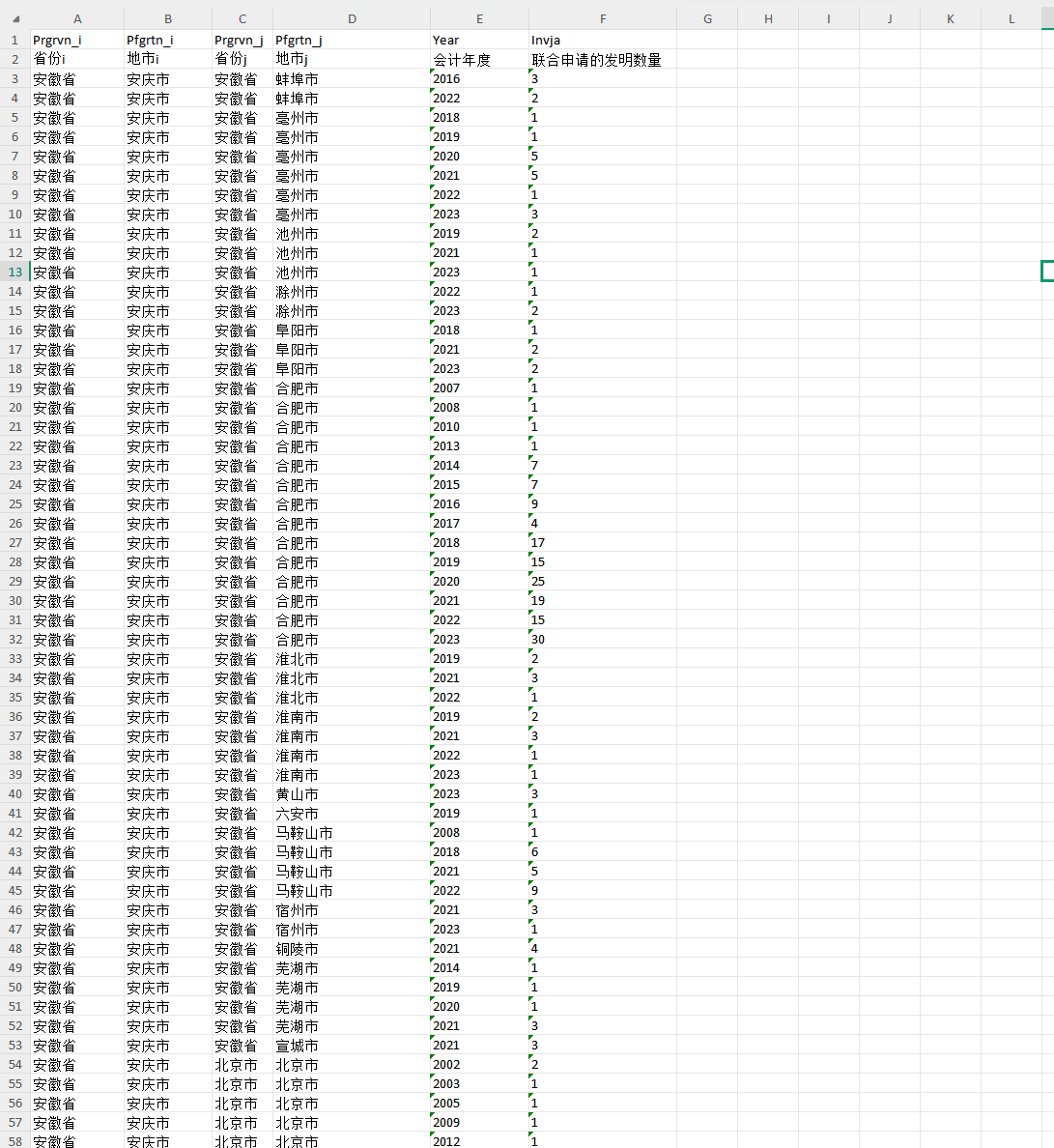 Invja[联合申请的发明数量]-地市i与地市j当年异地联合申请发明专利的数量