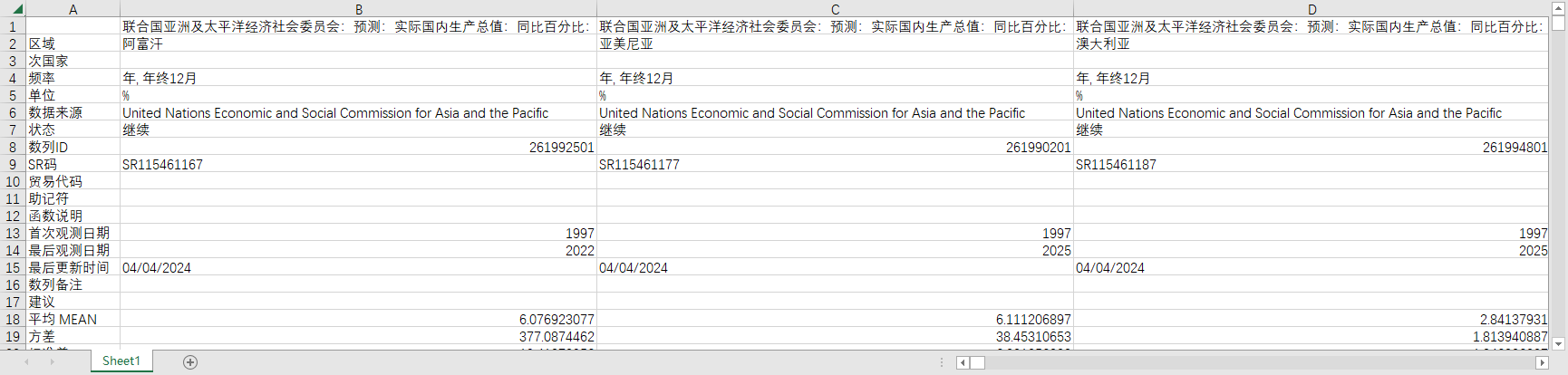 国民经济核算预测全球世界各国地区1997-2025国内生产总值GDP联合国亚太经社会经济体