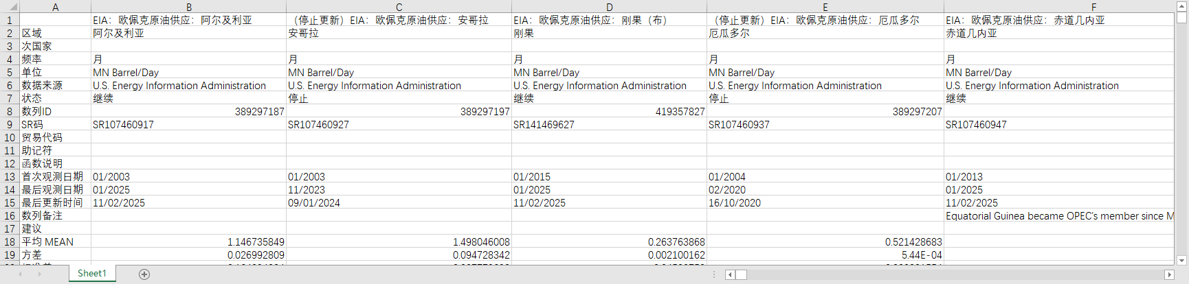 EIA:欧佩克原油供应:阿尔及利亚 (停止更新)EIA:欧佩克原油供应:安哥拉 EIA:欧佩克原油供应:刚果(布) (停止更新)EIA:欧佩克原油供应:厄瓜多尔 EIA:欧佩克原油供应:赤道几内亚 EIA:欧佩克原油供应:加蓬 EIA:欧佩克原油供应:伊朗 EIA:欧佩克原油供应:伊拉克 EIA:欧佩克原油供应:科威特 EIA:欧佩克原油供应:利比亚 EIA:欧佩克原油供应:尼日利亚 (停止更新)EIA:欧佩克原油供应:卡塔尔 EIA:欧佩克原油供应:沙特阿拉伯 EIA:欧佩克原油供应:阿拉伯联合酋长国 EIA:欧佩克原油供应:委内瑞拉 EIA预测:非欧佩克石油和其他液体能源供应:非洲:埃及 (停止更新)EIA预测:非欧佩克石油和其他液体能源供应:非洲:赤道几内亚 EIA预测:非欧佩克石油和其他液体能源供应:非洲:南苏丹 EIA预测:非欧佩克石油和其他液体能源供应:亚洲和大洋洲:澳大利亚 EIA预测:非欧佩克石油和其他液体能源供应:亚洲和大洋洲:中国 EIA预测:非欧佩克石油和其他液体能源供应:亚洲和大洋洲:印度 EIA预测:非欧佩克石油和其他液体能源供应:亚洲和大洋洲:印度尼西亚 EIA预测:非欧佩克石油和其他液体能源供应:亚洲和大洋洲:马来西亚 (停止更新)EIA预测:非欧佩克石油和其他液体能源供应:亚洲和大洋洲:越南 EIA预测:非欧佩克石油和其他液体能源供应:中南美洲:阿根廷 EIA预测:非欧佩克石油和其他液体能源供应:中南美洲:巴西 EIA预测:非欧佩克石油和其他液体能源供应:中南美洲:哥伦比亚 EIA预测:非欧佩克石油和其他液体能源供应:中南美洲:厄瓜多尔 EIA预测:非欧佩克石油和其他液体能源供应:欧亚大陆:阿塞拜疆 EIA预测:非欧佩克石油和其他液体能源供应:欧亚大陆:哈萨克斯坦 EIA预测:非欧佩克石油和其他液体能源供应:欧亚大陆:俄罗斯 EIA预测:非欧佩克石油和其他液体能源供应:欧亚大陆:土库曼斯坦 EIA预测:非欧佩克石油和其他液体能源供应:欧洲:挪威 EIA预测:非欧佩克石油和其他液体能源供应:欧洲:英国 EIA预测:非欧佩克石油和其他液体能源供应:中东:阿曼 EIA预测:非欧佩克石油和其他液体能源供应:中东:卡塔尔 EIA预测:非欧佩克石油和其他液体能源供应:北美:加拿大 EIA预测:非欧佩克石油和其他液体能源供应:北美:墨西哥 EIA预测:非欧佩克石油和其他液体能源供应:北美:美国 EIA预测:石油及其他液体能源供应:加拿大 EIA预测:石油及其他液体能源供应:中国 EIA预测:石油及其他液体能源供应:前苏联 EIA预测:石油及其他液体能源供应:墨西哥 EIA预测:石油及其他液体能源供应:美国(50州) EIA预测:石油及其他液体能源消费:巴西 EIA预测:石油及其他液体能源消费:加拿大 EIA预测:石油及其他液体能源消费:中国 EIA预测:石油及其他液体能源消费:印度 EIA预测:石油及其他液体能源消费:日本 EIA预测:石油及其他液体能源消费:墨西哥 EIA预测:石油及其他液体能源消费:俄罗斯 EIA预测:石油及其他液体能源消费:美国(50州) EIA预测:石油及其他液体能源消费:美国领土 EIA预测:原油和其他液体能源净提取总量:美国(50州) EIA预测:商业原油和其他液体能源库存:美国商业库存