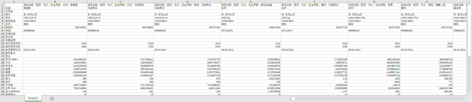 商品价格:预测:名义:农业原料:日志:喀麦隆 商品价格:预测:名义:农业原料:日志:马来西亚 商品价格:预测:名义:农业原料:锯材:马来西亚 商品价格:预测:名义:农业原料:棉花A指数 商品价格:预测:名义:农业原料:橡胶:马来西亚 商品价格:预测:名义:农业原料:烟草 商品价格:预测:名义:肥料:磷酸二铵 商品价格:预测:名义:肥料:磷矿 商品价格:预测:名义:肥料:氯化钾 商品价格:预测:名义:肥料:TSP 商品价格:预测:名义:肥料:尿素 (停止更新)商品价格:预测:名义:农业原料:棉花A指数 (停止更新)商品价格:预测:名义:农业原料:橡胶:马来西亚 商品价格:预测:实际:农业原料:日志:喀麦隆 商品价格:预测:实际:农业原料:日志:马来西亚 商品价格:预测:实际:农业原料:锯材:马来西亚 商品价格:预测:实际:农业原料:棉花A指数 商品价格:预测:实际:农业原料:橡胶:马来西亚 商品价格:预测:实际:农业原料:烟草 商品价格:预测:实际:肥料:磷酸二铵 商品价格:预测:实际:肥料:磷矿 商品价格:预测:实际:肥料:氯化钾 商品价格:预测:实际:肥料:TSP 商品价格:预测:实际:肥料:尿素 (停止更新)商品价格:预测:实际:农业原料:棉花A指数 (停止更新)商品价格:预测:实际:农业原料:橡胶:马来西亚
