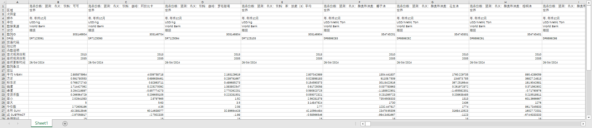 商品价格:预测:名义:饮料:可可 商品价格:预测:名义:饮料:咖啡:阿拉比卡 商品价格:预测:名义:饮料:咖啡:罗布斯塔 商品价格:预测:名义:饮料:茶:拍卖(3)平均 商品价格:预测:名义:脂类和油类:椰子油 商品价格:预测:名义:脂类和油类:花生油 商品价格:预测:名义:脂类和油类:棕榈油 商品价格:预测:名义:脂类和油类:大豆粕 商品价格:预测:名义:脂类和油类:大豆油 商品价格:预测:名义:脂类和油类:大豆 商品价格:预测:名义:谷物:大麦 商品价格:预测:名义:谷物:玉米 商品价格:预测:名义:谷物:米:泰国:5% 商品价格:预测:名义:谷物:小麦:美国:硬红冬小麦 商品价格:预测:名义:其他食物:欧盟香蕉 商品价格:预测:名义:其他食物:肉类:牛肉 商品价格:预测:名义:其他食物:肉类:鸡 商品价格:预测:名义:其他食物:橘子 商品价格:预测:名义:其他食物:虾 商品价格:预测:名义:其他食物:糖:全球 (停止更新)商品价格:预测:名义:饮料:可可 (停止更新)商品价格:预测:名义:饮料:咖啡:阿拉比卡 (停止更新)商品价格:预测:名义:饮料:咖啡:罗布斯塔 (停止更新)商品价格:预测:名义:饮料:茶:拍卖(3)平均 (停止更新)商品价格:预测:名义:其他食物:美国香蕉 (停止更新)商品价格:预测:名义:其他食物:肉类:牛肉 (停止更新)商品价格:预测:名义:其他食物:肉类:鸡 (停止更新)商品价格:预测:名义:其他食物:橘子 (停止更新)商品价格:预测:名义:其他食物:虾 (停止更新)商品价格:预测:名义:其他食物:糖:全球 商品价格:预测:实际:饮料:可可 商品价格:预测:实际:饮料:咖啡:阿拉比卡 商品价格:预测:实际:饮料:咖啡:罗布斯塔 商品价格:预测:实际:饮料:茶:拍卖(3)平均 商品价格:预测:实际:脂类和油类:椰子油 商品价格:预测:实际:脂类和油类:花生油 商品价格:预测:实际:脂类和油类:棕榈油 商品价格:预测:实际:脂类和油类:大豆粕 商品价格:预测:实际:脂类和油类:大豆油 商品价格:预测:实际:脂类和油类:大豆 商品价格:预测:实际:谷物:大麦 商品价格:预测:实际:谷物:玉米 商品价格:预测:实际:谷物:米:泰国:5% 商品价格:预测:实际:谷物:小麦:美国:硬红冬小麦 商品价格:预测:实际:其他食物:欧盟香蕉 商品价格:预测:实际:其他食物:肉类:牛肉 商品价格:预测:实际:其他食物:肉类:鸡 商品价格:预测:实际:其他食物:橘子 商品价格:预测:实际:其他食物:虾 商品价格:预测:实际:其他食物:糖:全球 (停止更新)商品价格:预测:实际:饮料:可可 (停止更新)商品价格:预测:实际:饮料:咖啡:阿拉比卡 (停止更新)商品价格:预测:实际:饮料:咖啡:罗布斯塔 (停止更新)商品价格:预测:实际:饮料:茶:拍卖(3)平均 (停止更新)商品价格:预测:实际:其他食物:美国香蕉 (停止更新)商品价格:预测:实际:其他食物:肉类:牛肉 (停止更新)商品价格:预测:实际:其他食物:肉类:鸡 (停止更新)商品价格:预测:实际:其他食物:橘子 (停止更新)商品价格:预测:实际:其他食物:虾 (停止更新)商品价格:预测:实际:其他食物:糖:全球