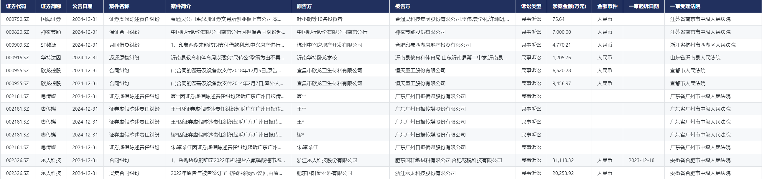A股上市公司诉讼仲裁数据,包含证券代码、证券简称、公告日期、原被告方、诉讼类型、涉案金额、起诉日期、判决内容、执行情况等字段。