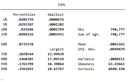 然后利用回归残差的样本标准差得到该股票在这个月的特质波动率。为了统一单位,我们将得到的标准差序列月度化,月度化的方法是用标准差乘以该股票当月交易日的平方根。这样就可以得到股票在第t个月的特质波动率IVOL的度量指标,即:
