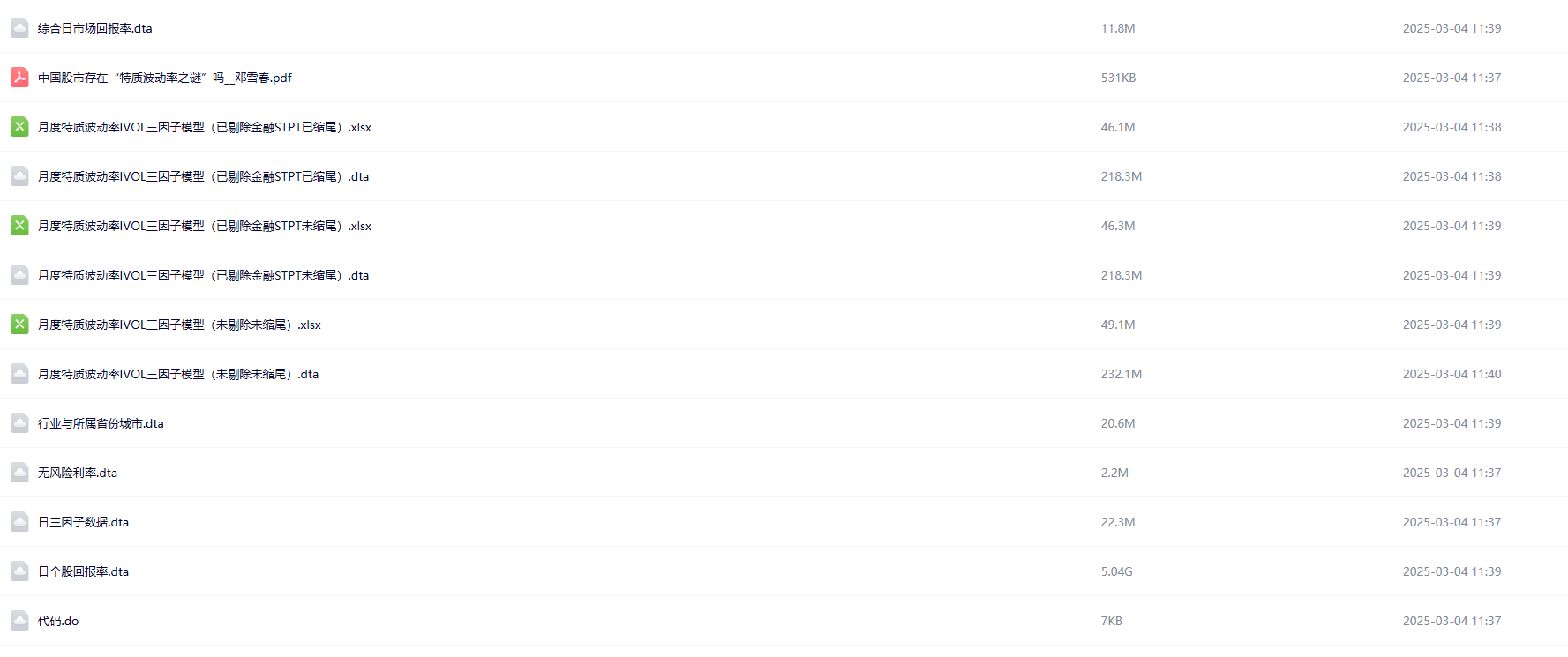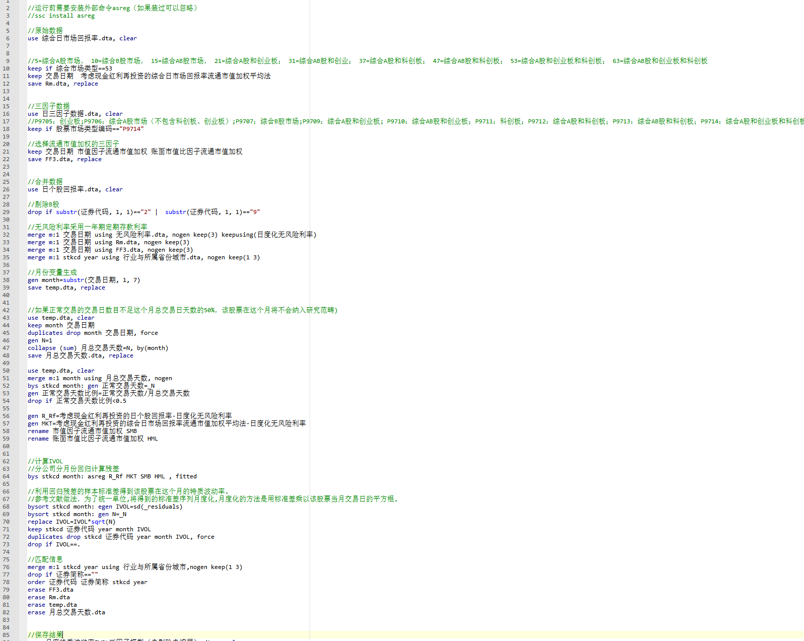 - 三个版本:月度特质波动率IVOL三因子模型(剔除金融STPT版)、月度特质波动率IVOL三因子模型(剔除金融STPT缩尾版)、月度特质波动率IVOL三因子模型(已剔除STPT未剔除金融版)