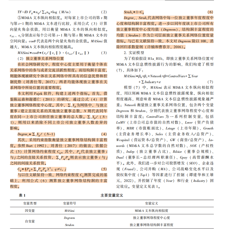 鲁乔杉.独立董事关系网络与MD&A文本信息惯性披露—基于程度中心度和结构洞视角[J].会计研究,2022,(09):39-51.