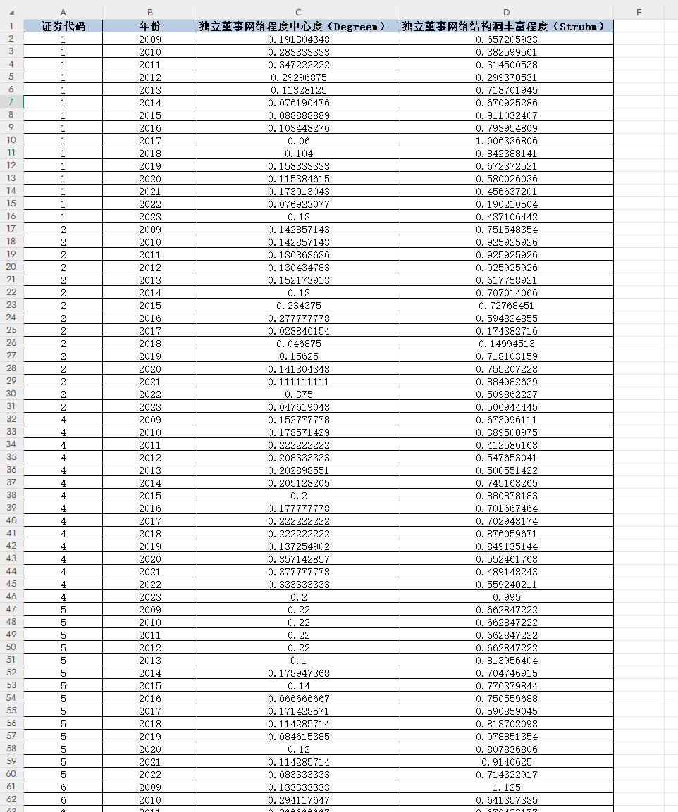 独立董事网络程度和网络结构洞数据是衡量独立董事在董事会中影响力和独立性的重要指标,对公司治理、信息披露质量和投资者决策都具有重要意义。