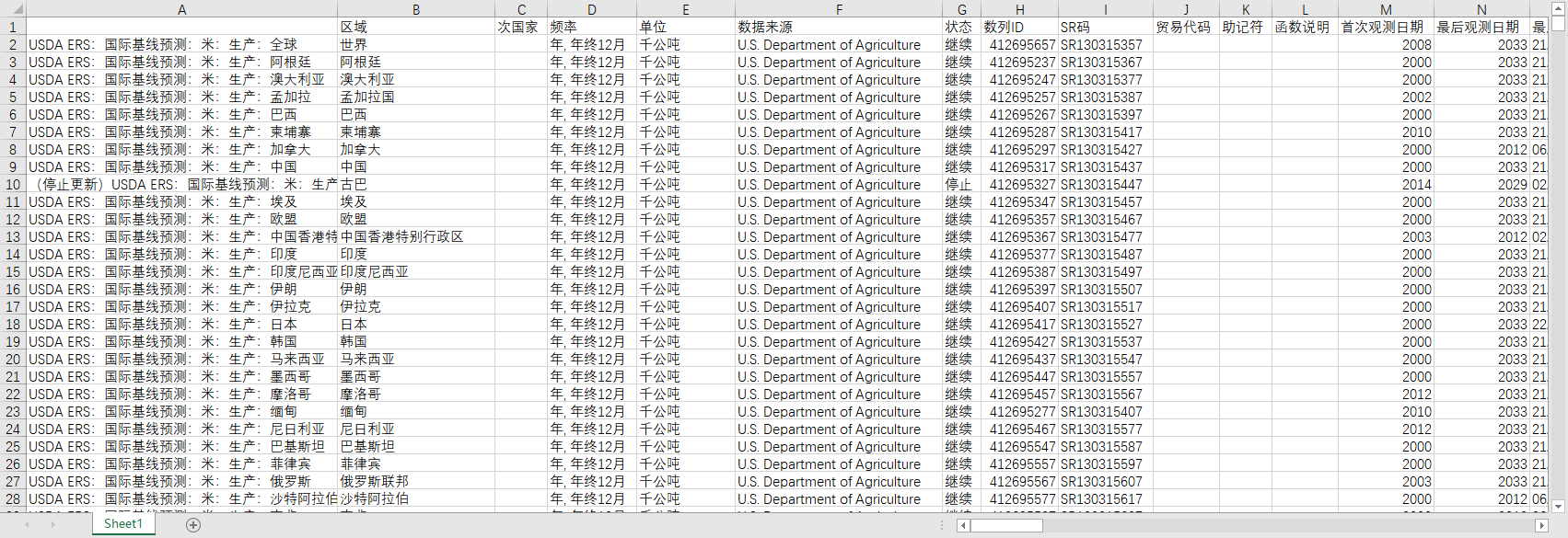 USDA国际基线预测预测全球世界各国地区农产品供应使用面积产量2000-2033米高粱大豆粕油小麦等