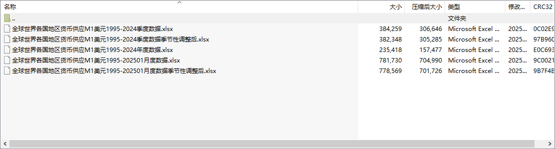 全球世界各国地区货币供应M1美元1995-202501月度数据季节性调整后