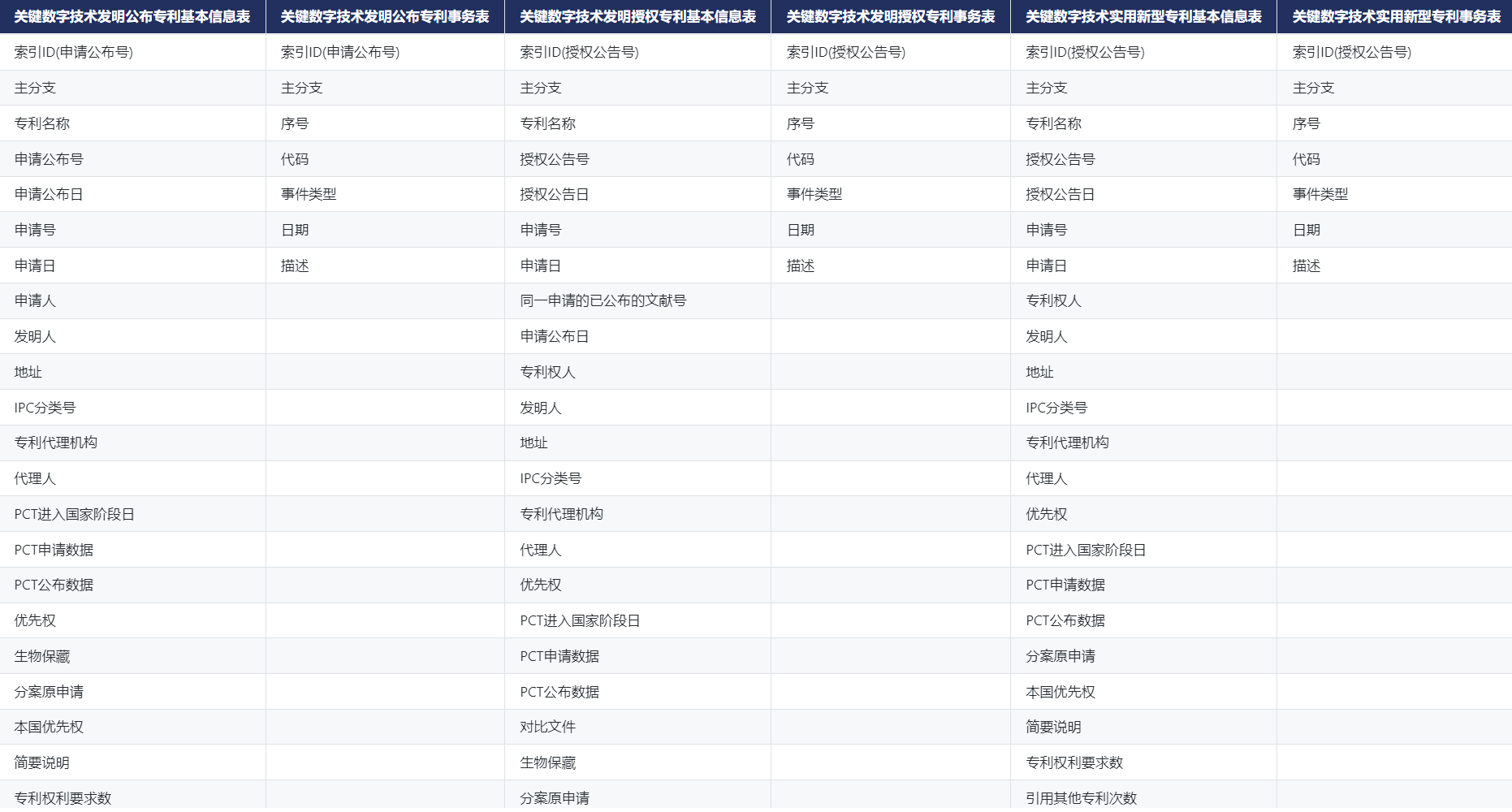CnOpenData依据上述标准为建库指导文件,推出中国关键数字技术专利申请与授权数据,分为发明公布专利、发明授权专利、实用新型专利三部分,分设基本信息表和事务表,以展现各类型专利的基本信息及法律状态信息,并与中国关键数字技术专利及引用被引用数据相呼应,以期为学术界提供更优质、先进的专利数据支持。