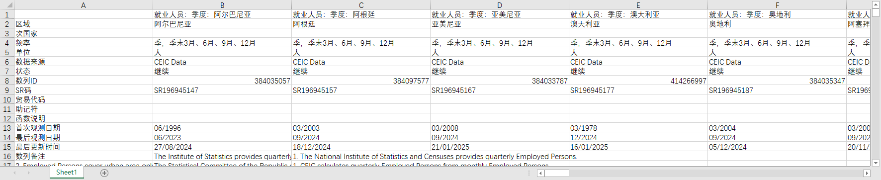 全球世界各国地区人口和劳动力市场就业人员数量1995-2024月度季度年度数据季节性调整后
