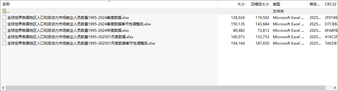 全球世界各国地区人口和劳动力市场就业人员数量1995-202501月度数据季节性调整后