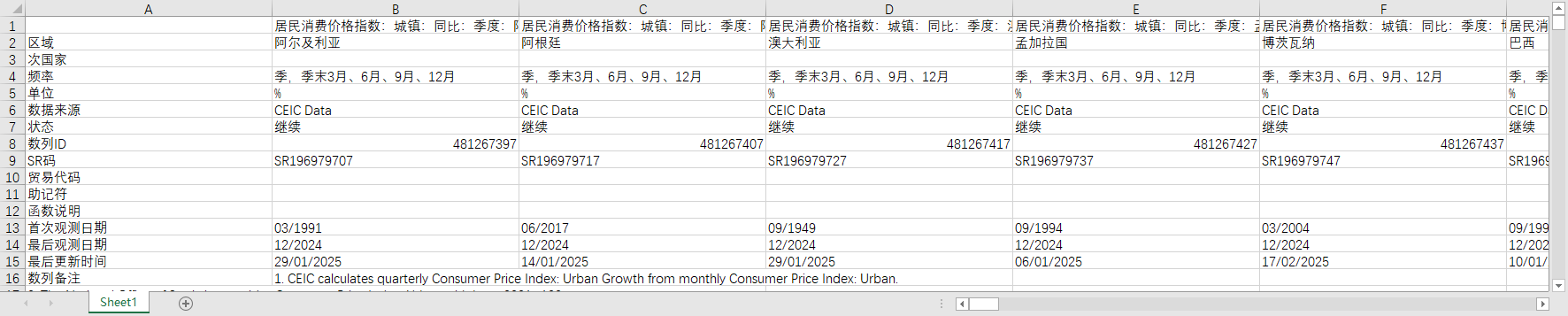 全球世界各国地区居民消费价格指数CPI城镇同比增长1990-202502月度数据季节性调整后
