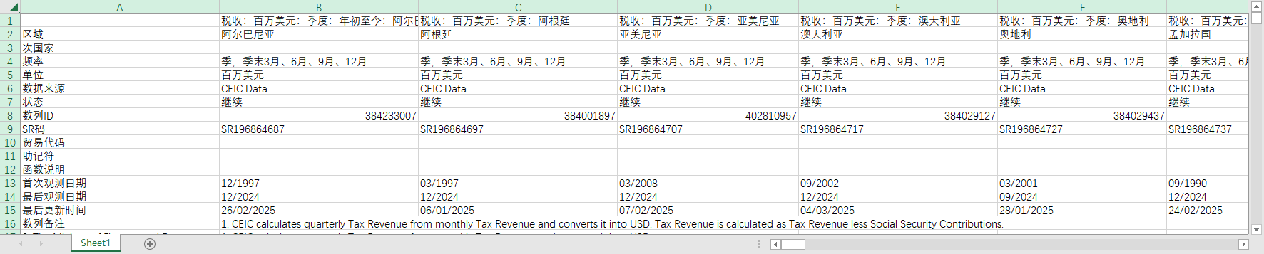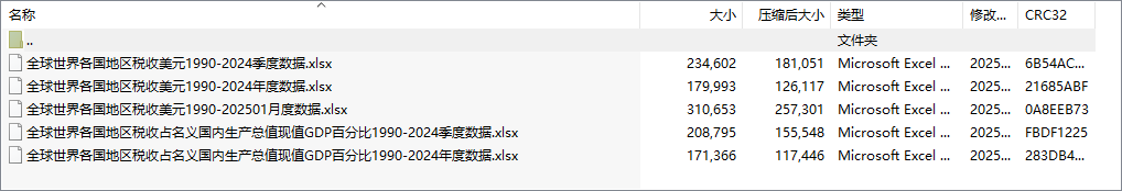 全球世界各国地区税收美元1990-202501月度数据