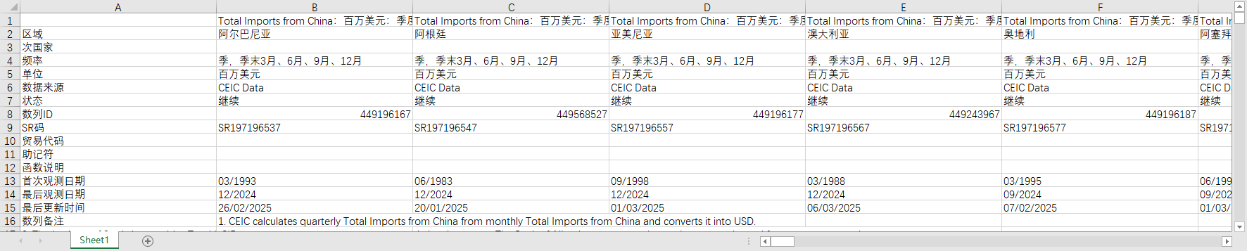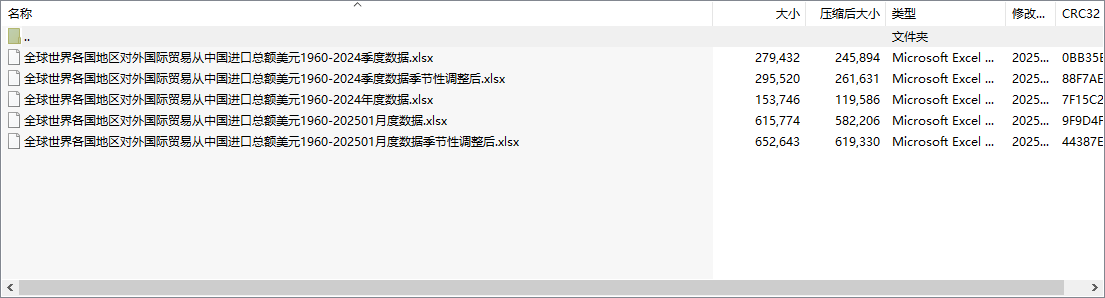 全球世界各国地区对外国际贸易从中国进口总额美元1960-202501月度数据季节性调整后