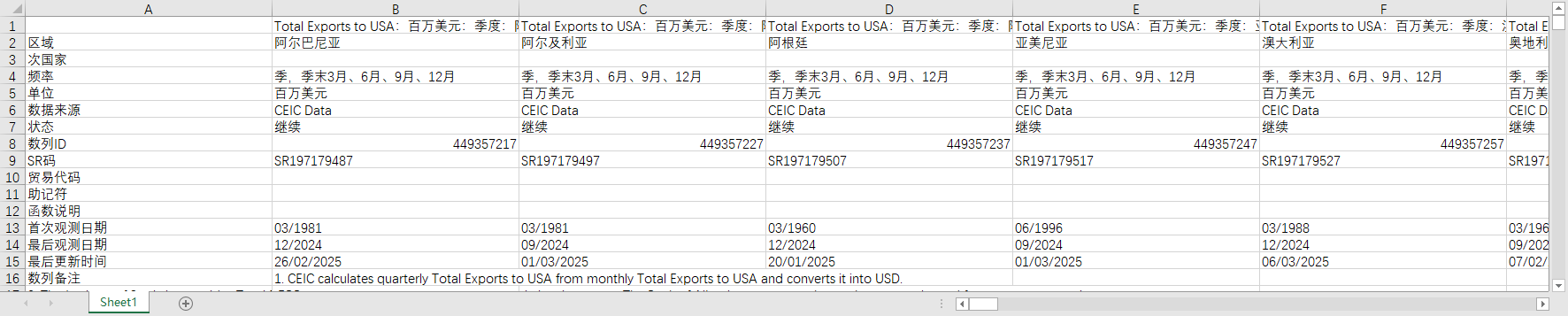 全球世界各国地区对外国际贸易向美国出口总额美元1960-202501月度数据