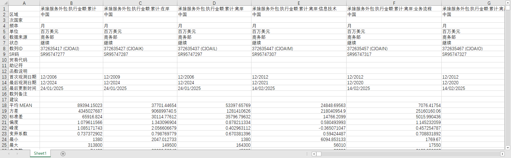 承接服务外包:执行金额:累计 承接服务外包:执行金额:累计:在岸 承接服务外包:执行金额:累计:离岸 承接服务外包:执行金额:累计:离岸:信息技术 承接服务外包:执行金额:累计:离岸:业务流程 承接服务外包:执行金额:累计:离岸:知识流程 承接服务外包:执行金额:累计 承接服务外包:执行金额:累计:在岸 承接服务外包:执行金额:累计:离岸 承接服务外包:执行金额:累计:离岸:信息技术 承接服务外包:执行金额:累计:离岸:业务流程 承接服务外包:执行金额:累计:离岸:知识流程