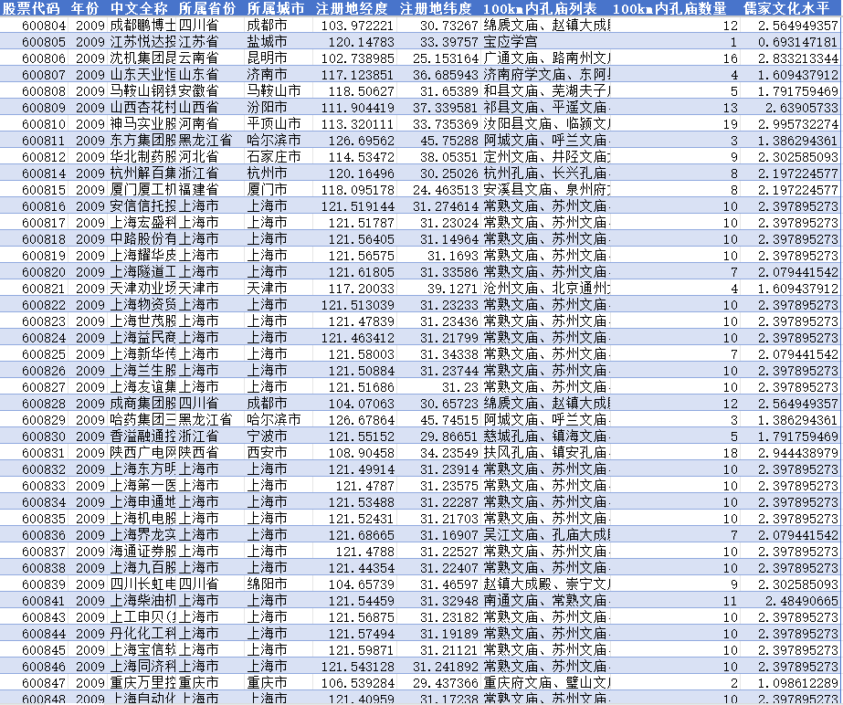 上市公司儒家文化水平数据集,从上市公司年报中拿到每年的上市公司信息,参考窦军生在经济管理发表的儒家文化测试方法,计算在上市公司注册地周围100公里内的孔庙遗存数量并+1取其自然对数,整理成面板数据,方便大家研究使用。