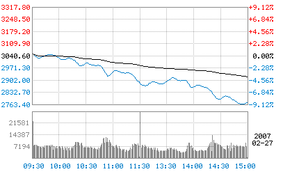 黑色星期二重现证券市场。2007年的2007亿元历史天量,在春节后的第二个交易日发生,所伴随的,是沪指一日狂泄8.84%、下跌268点的历史单日最大点数跌幅。