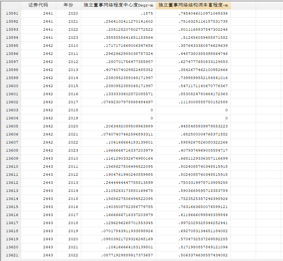 证券代码、年份、独立董事网络程度中心度、独立董事网络结构洞丰富程度