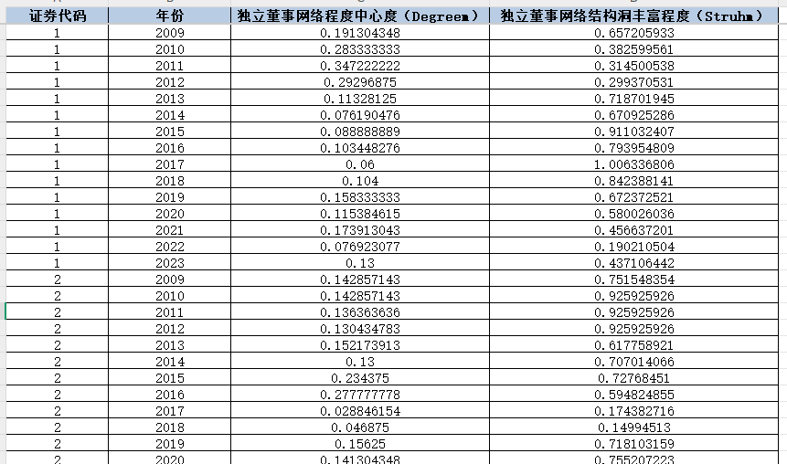上市公司-独立董事网络程度中心度网络结构洞数据(2009-2023年),整理好的面板数据,excel或stata版本