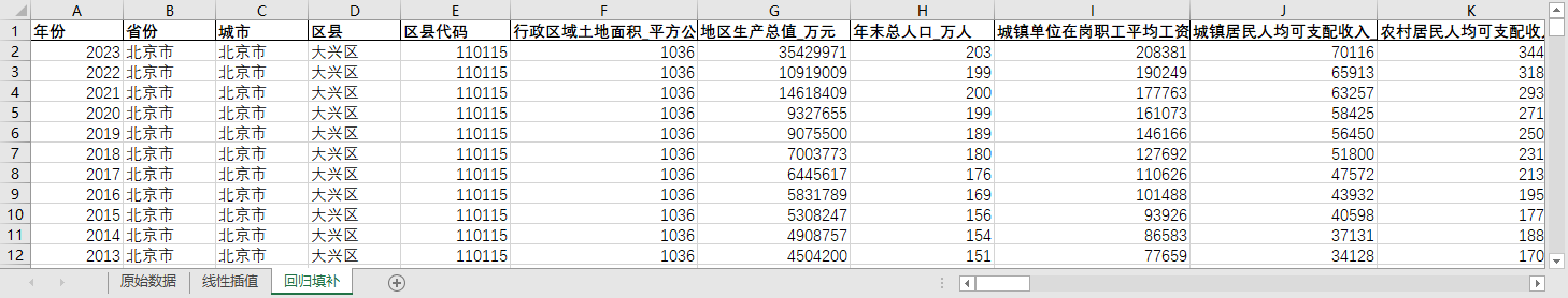 excel数据文件包原始数据(由于多年度指标不同存在缺失值)、线性插值、回归填补三个版本,提供您参考使用。