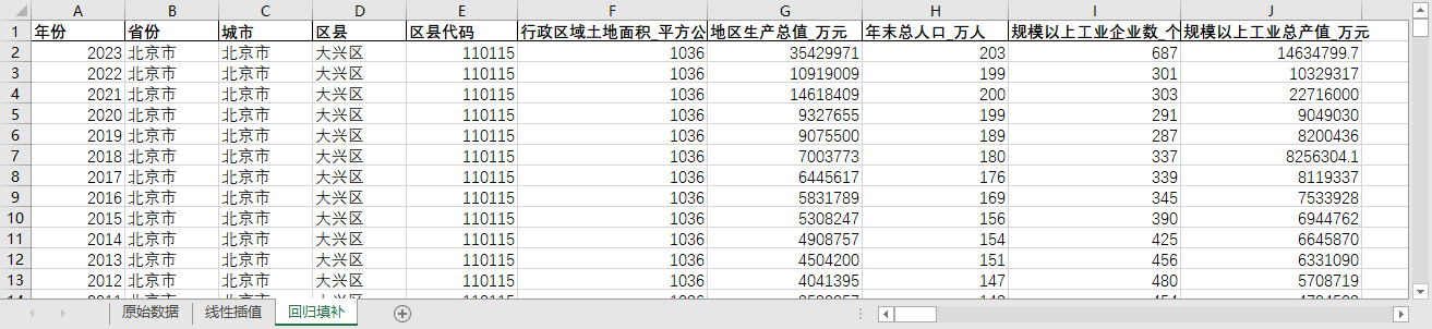 excel数据文件包原始数据(由于多年度指标不同存在缺失值)、线性插值、回归填补三个版本,提供您参考使用。