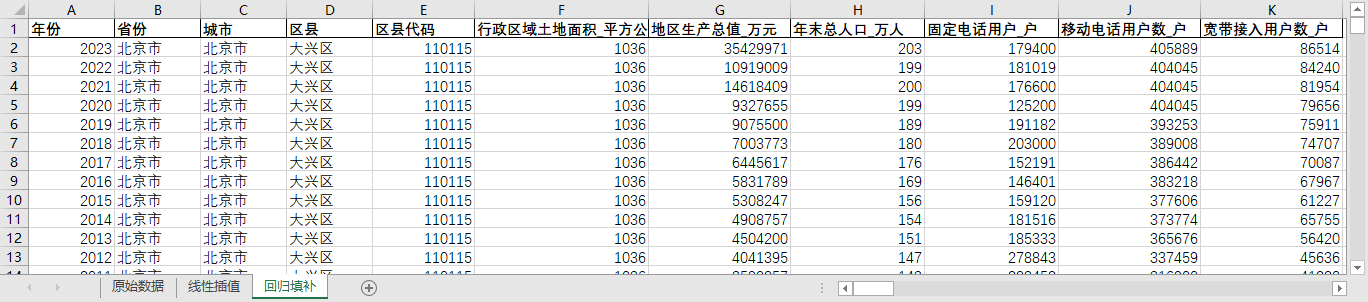 全国2708个区县移动固定电话用户数宽带接入用户数年末总人口GDP地区生产总值2000-2023含无缺失值填补